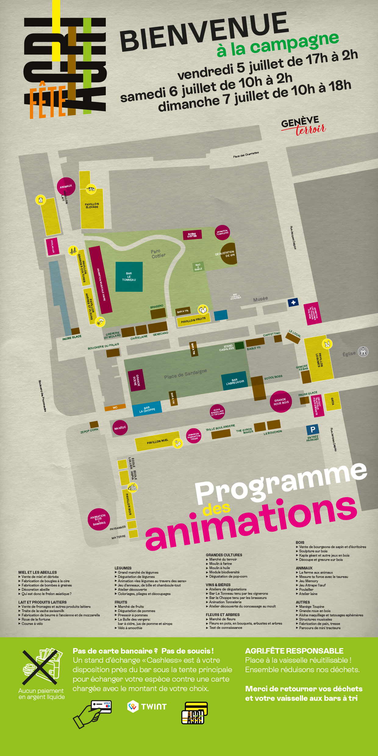 Des fleurs au vin, en passant par l'élevage, les fruits, les légumes ou encore le miel, toutes les filières agricoles du canton y seront représentées. Il y aura de belles surprises à découvrir au travers de multiples pavillons thématiques, chacun dédié à une filière spécifique. Chaque pavillon comportera quatre volets : informations, animations, dégustation et vente et vous permettra de partir à la rencontre des acteurs du terroir genevois.