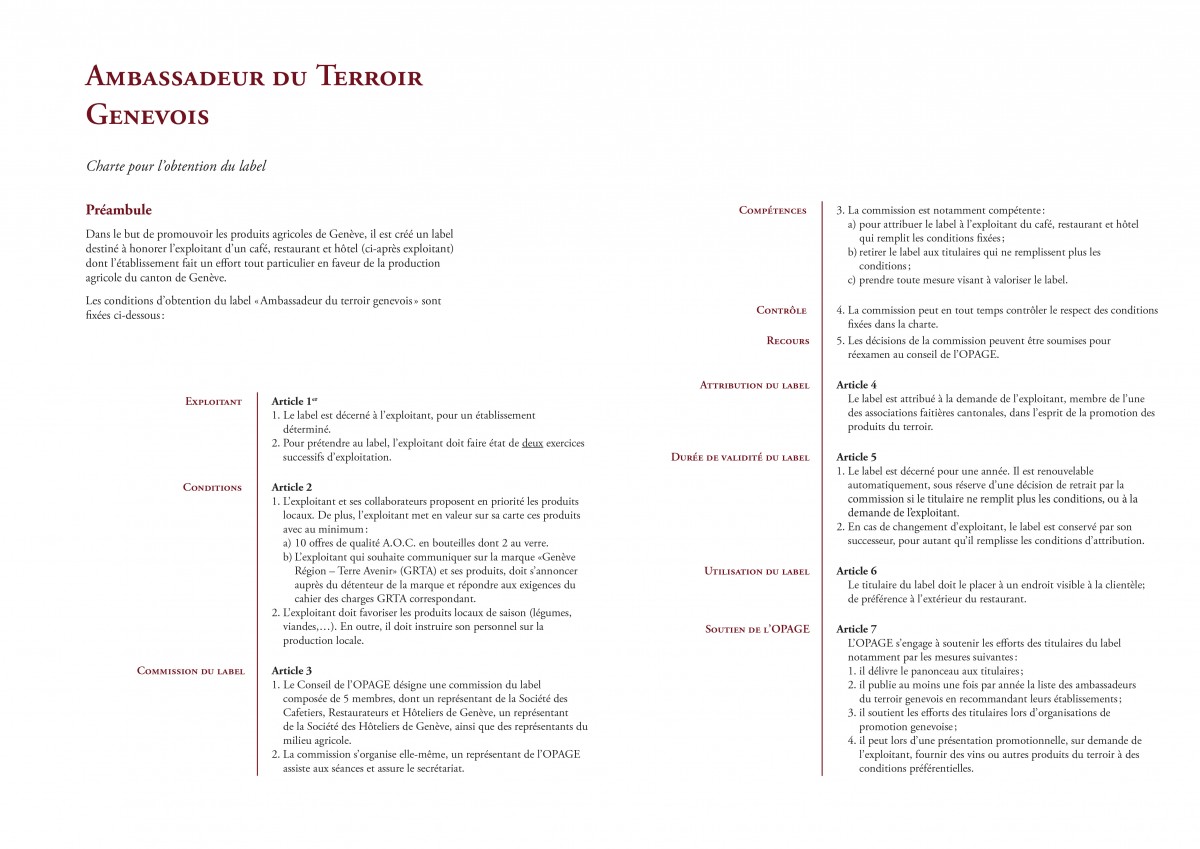 Créée en 1997, le label est valable une année et renouvelable si l’établissement continue à remplir les conditions de son obtention. Il est attribué par la Commission du label composée de 5 membres représentant la Société des Cafetiers Restaurateurs, la Société des Hôteliers de Genève, ainsi que de trois représentants des milieux agricoles (deux viticulteurs et un maraîcher)...